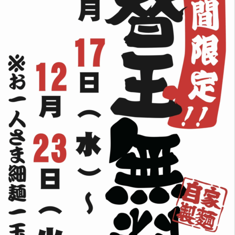 ラーメン工房ふくや・麺堂香より、日頃ご来店頂いてる皆様に感謝の気持ちを込めて替玉無料を開催致します。 期間は12月10日(火)~12月17日(火)までの間、ラーメン工房 ふくや別府総本店・アミュプラザおおいた麺堂香 高城 […]