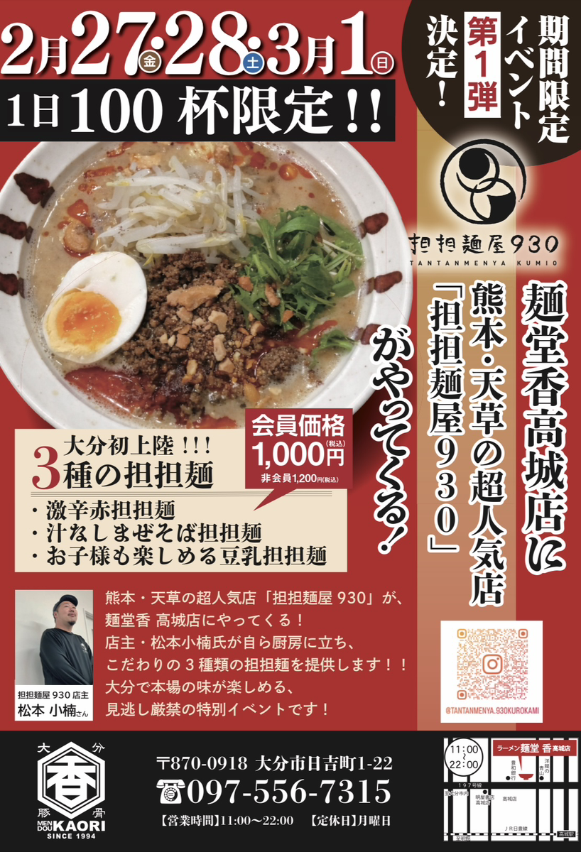 いつも「麺堂香」をご利用いただきありがとうございます。 今度は『麺堂香 高城店』限定で、スペシャルコラボイベントの開催が決定いたします。 熊本・天草の超人気店 『担担麺屋930(クミオ)』です! 店主・松本小楠氏が自ら厨房に立ち、こだわりの3種類の担担麺を提供します‼︎ 大分で本場の味が楽しめる、見逃し厳禁の特別イベントです!