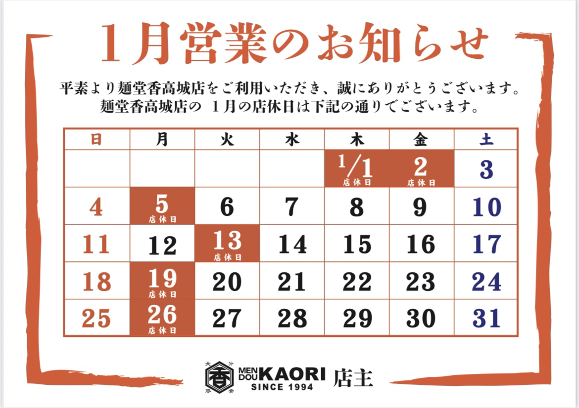 1月店休日のお知らせ。 いつも麺堂香高城店ををご利用いただき誠にありがとうございます。2026年もどうぞ宜しくお願い致します。 1月の店休日は上記の通りとなります。たくさんのご来店お待ちしております。